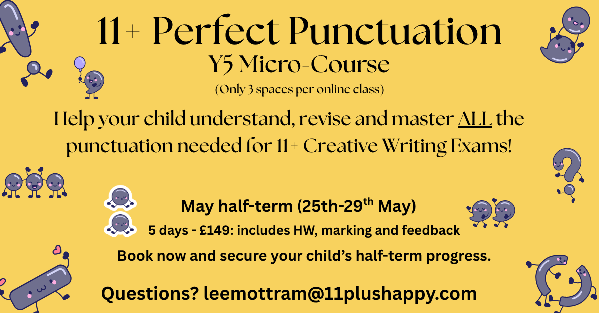 This is a 5-day intensive course (Mon–Fri, 4–5pm) designed to make real progress in basic and advanced punctuation, essential for 11+ success. Perfect for Y5 students in the final year of preparation.